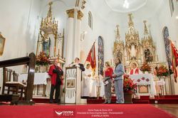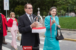 O Casal festeiro Paulo Sérgio Gallotti Prisco Paraíso e Sandra Mara Meyer Prisco Paraíso, juntamente com o vice-provedor e diretores da IDES/PROMENOR, participaram no sábado, 15, da Procissão de lançamento do Ciclo do Espírito Santo em Florianópolis – integração das 14 comunidades que cultuam o Espírito Santo e realizam procissão e cortejos imperiais na capital.